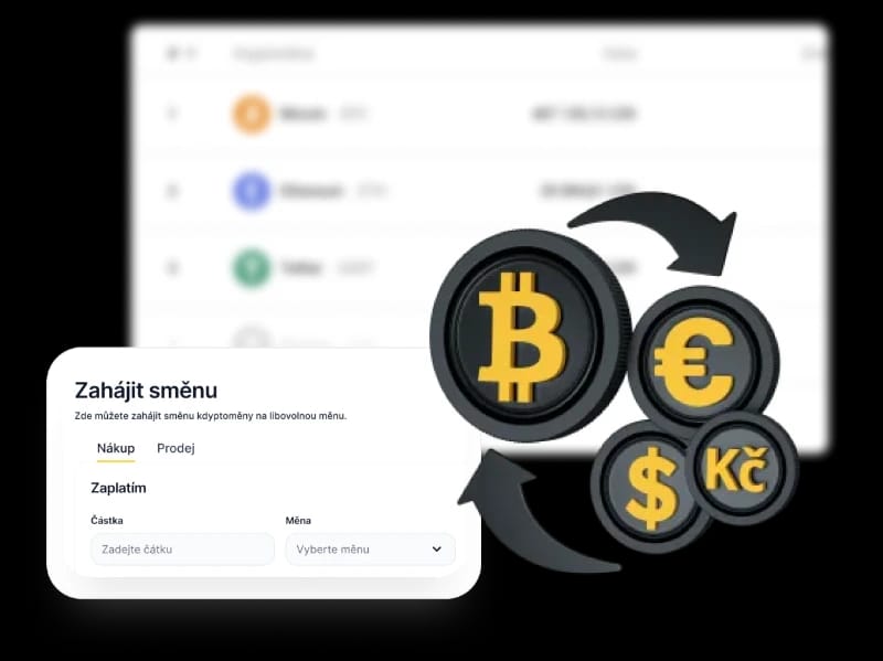 Nákup kryptoměn na firmuSměnárenský softwarePlatba faktur kryptoměnamiSměna kryptoměnPravidelné spořeníAffiliateZákaznická sekce